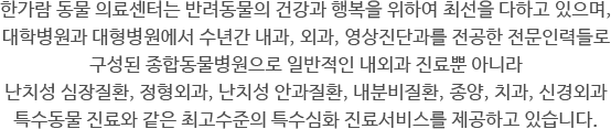 서울시 영등포구 영등포로 387 (중앙빌딩) 한가람 동물의료센터 (지번 : 서울시 영등포구 신길 65-106) 대표 : 장민석 | 사업자등록번호 : Copyright © 2016 365 한가람 동물의료센터 All rights reserved.